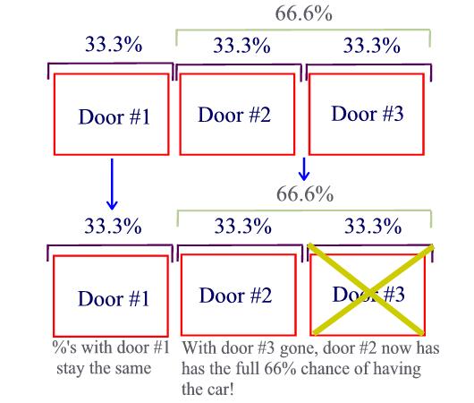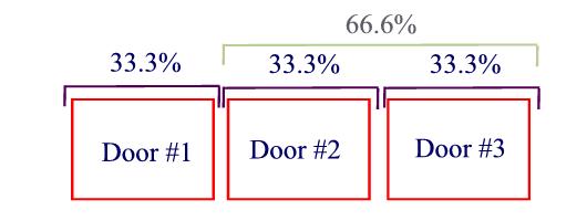 However, after door # 3 is eliminated, you are left with doors one and two.  You can see in the diagram below why door #2 has a 66.6% chance and door #1 remains at 33.3%: