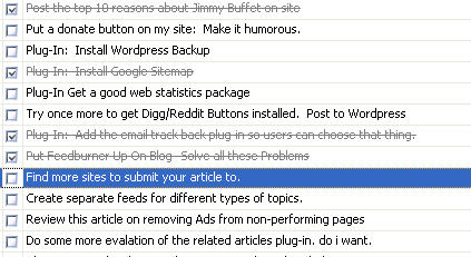 I maintain a list using the Task feature in Microsoft Outlook. It currently contains a prioritized list of over 150 tasks separated into 3 categories: content, technology, and readership. Here’s a sample: