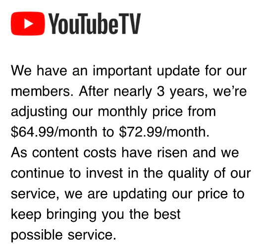 But, now it’s years later and at $72.99, YouTube TV is more than double its original price.